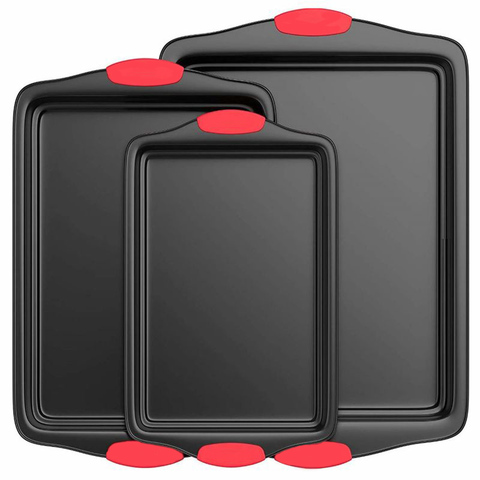 Cucina Forno 3 Pezzo di Cottura Pan Biscotto Foglio Deluxe Antiaderente Grigio Rivestimento In Acciaio Al Carbonio Bakeware Set Con Red Maniglie In Silicone