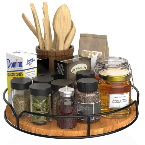 ถาดหมุนไม้10นิ้วสำหรับจัดระเบียบโต๊ะโลหะพร้อมแผ่นปูกันลื่นสำหรับวางบนเคาน์เตอร์ห้องครัว